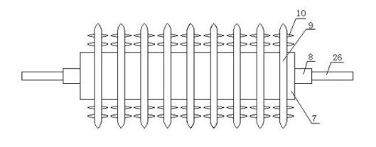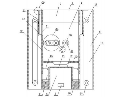 新型高效的土壤修復(fù)裝置包括機(jī)架以及土壤輸送系統(tǒng)、破碎箱、攪拌裝置,土壤輸送系統(tǒng)、破碎箱、攪拌裝置均固定安裝在機(jī)架內(nèi),破碎箱包括箱體,箱體內(nèi)設(shè)有破碎裝置,箱體的頂部設(shè)有進(jìn)料口,底部設(shè)有出料口。土壤輸送系統(tǒng)的輸送終端位于箱體的進(jìn)料口的上方,箱體的出料口通過(guò)運(yùn)輸裝置與攪拌裝置連接。攪拌裝置內(nèi)設(shè)有攪拌棒以及修復(fù)劑噴淋系統(tǒng),箱體的內(nèi)部通過(guò)隔板分成破碎腔、回料腔以及出料腔,破碎裝置安裝在破碎腔內(nèi),回料腔的底部與出料腔相通,回料腔的頂部與破碎腔相通,回料腔內(nèi)設(shè)有回料傳送裝置。